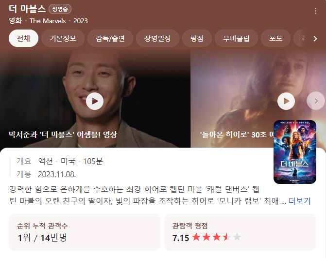 더 마블스 평점은 현재 네이버기준 7.15점으로 상당히 높은 점수입니다.