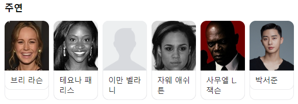 '더 마블스'의 출연진은 캡틴 마블역의 브리라슨, 테요나 패리스, 이만 베라니, 자웨 애쉬튼, 사무엘 L 잭슨, 박서준 그리고 고양이 구스입니다.