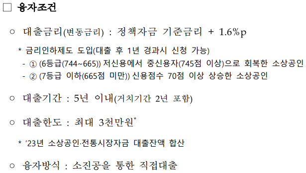 주의할 점은 올해는 2023년 소상공인 전통시장자금 대출잔액을 합산하므로 작년에 3,000만원을 전부 대출받은 분들은 올해 받을 수 있는 자금이 없습니다.