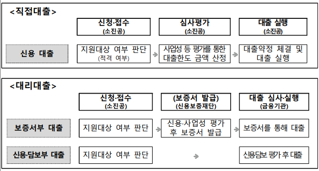 ▶직접대출: 소진공이 융자 접수 평가 대출 실행까지 진행합니다.