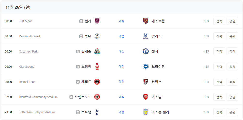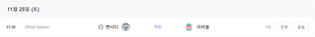 프리미어리그 순위 1위와 2위의 경기가 11월 25일 21:30분에 진행될 예정입니다.