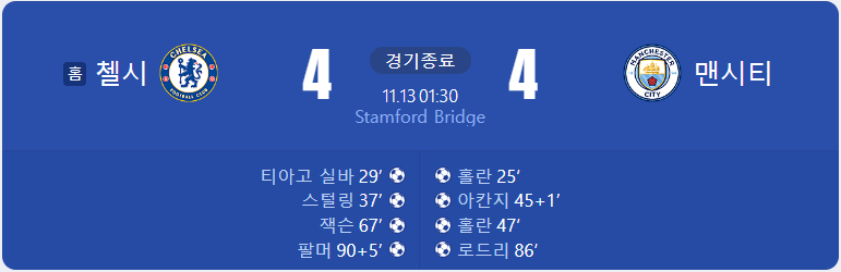 맨시티는 프리미어리그 순위 1위를 유지했고, 첼시는 승점 16점이 되어 10위로 올라왔지만