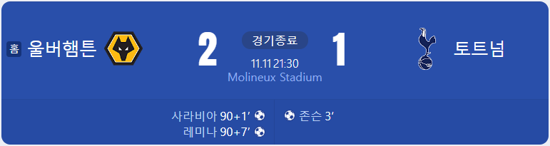 12R 토트넘 vs 울버햄튼 경기에서 선제골을 넣었지만 아쉽게도 2:1으로 패했습니다.