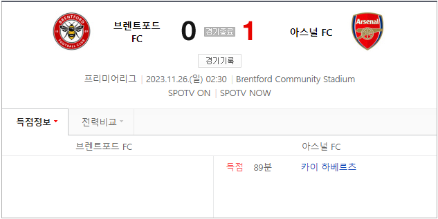 2023-24 11월 26일에 치러진 아스널 vs 브렌트포드의 경기가