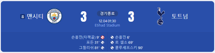 2023-24 프리미어리그 12월 4일 14R 손흥민 9호골 ! 토트넘 맨시티 경기 결과 EPL 최신 순위 및 12월 경