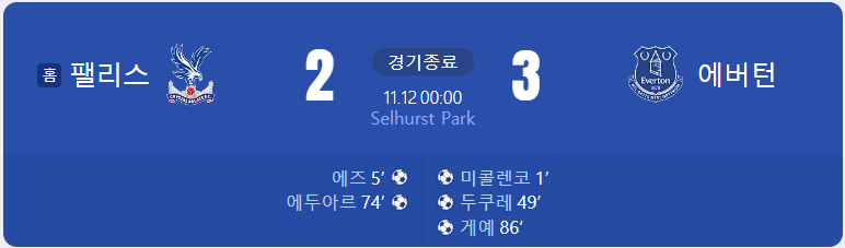 12R 에버턴 vs 크리스탈 팰리스 경기에서 3:2으로 승리를 가져간 에버턴은