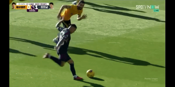 전반 9분 울버햄튼 쿠냐의 돌파로 위기를 맞은 토트넘을 구해준 벤 데이비스입니다.