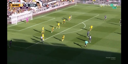 전반 5분 손흥민이 호이비에르에게 패스를 하고 침투를 하는 과정입니다.
