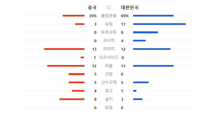 대한민국과 중국의 볼점유율은 65:35로 압도적인 차이였습니다.