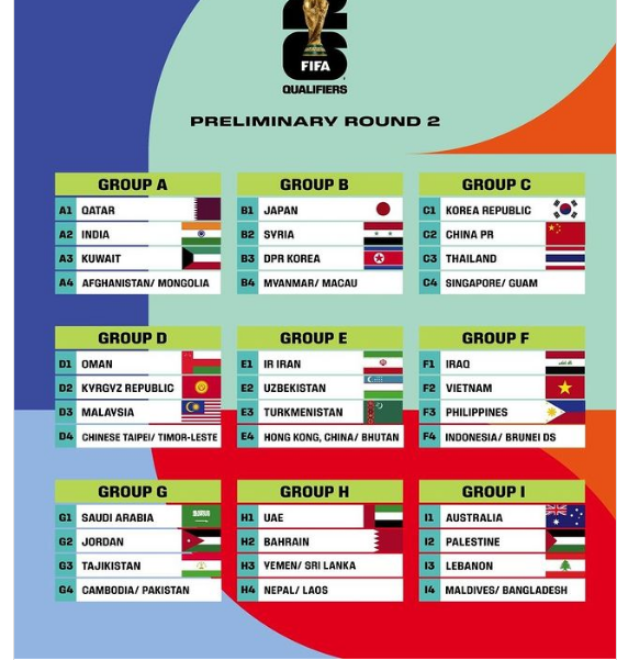 아시아 2차 예선은 4개의 나라가 1개의 조로 편성되어 총 9개의 조가 경기를 진행합니다.