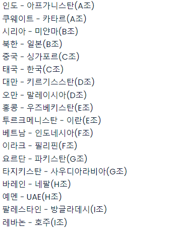 아시아 2차 예선은 4개국이 1조로 총 9개의 조로 구성되어 있습니다.