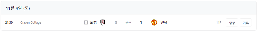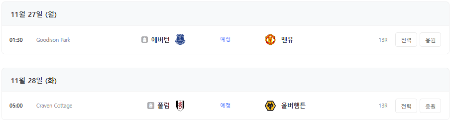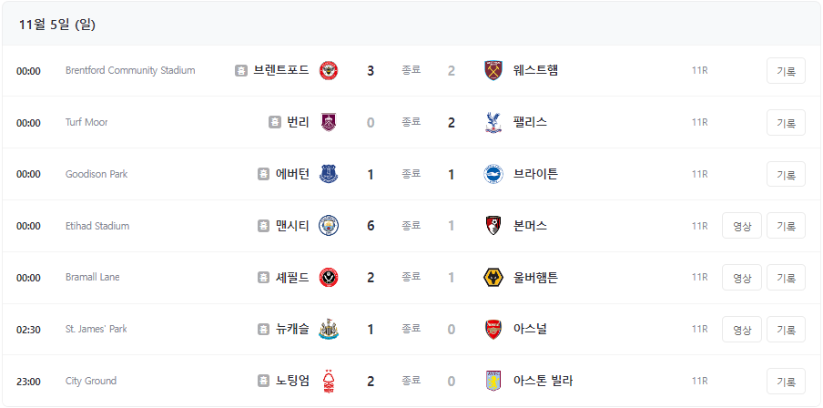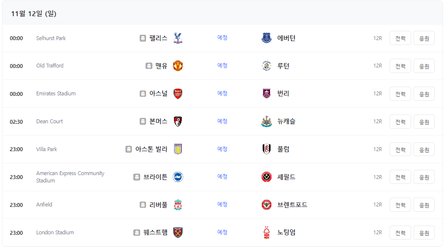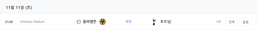 현재 11R는 모두 종료된 상태이며, 11월 11일 토트넘과 울버햄튼의 경기를 기점으로 12R가 시작됩니다.
